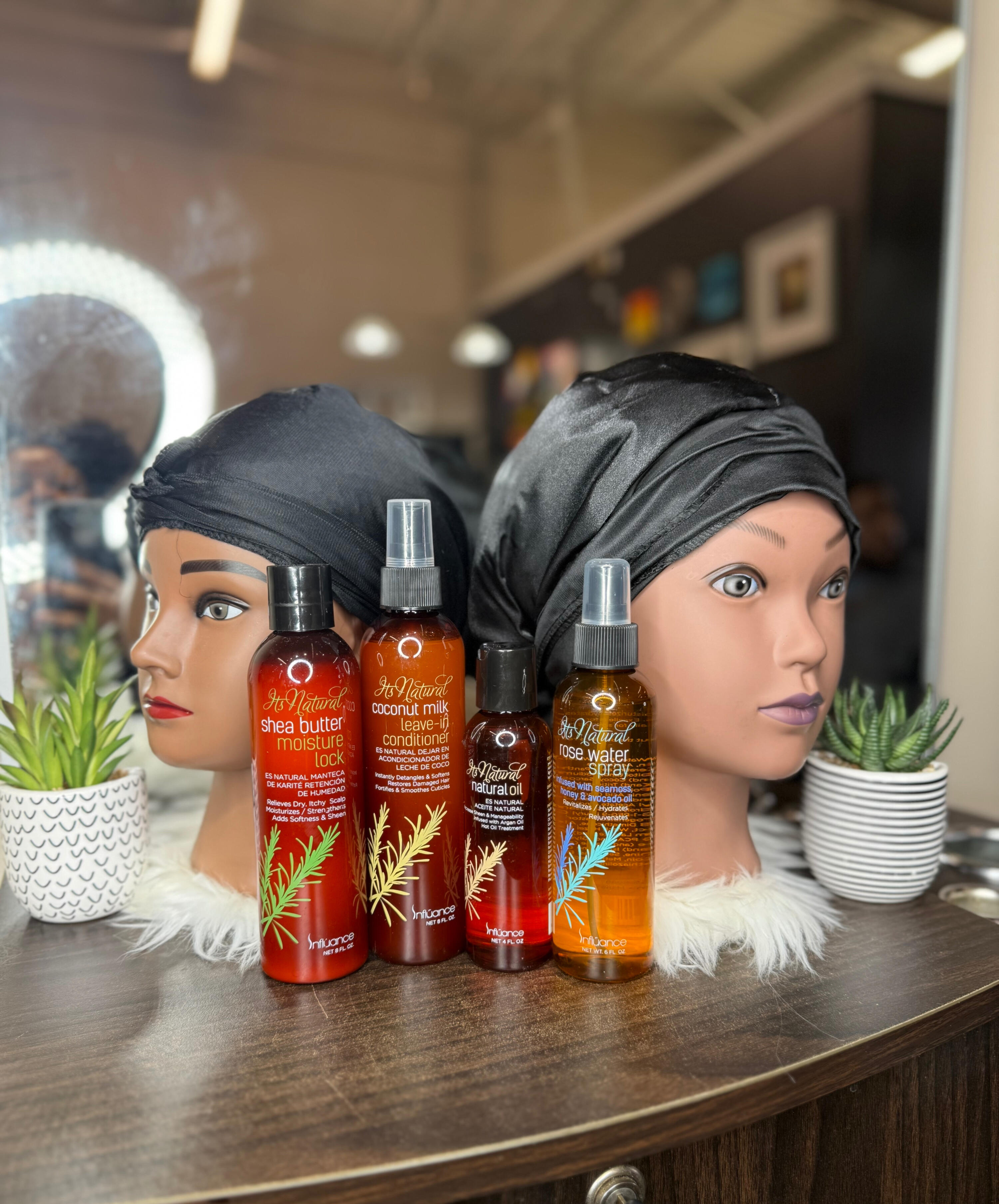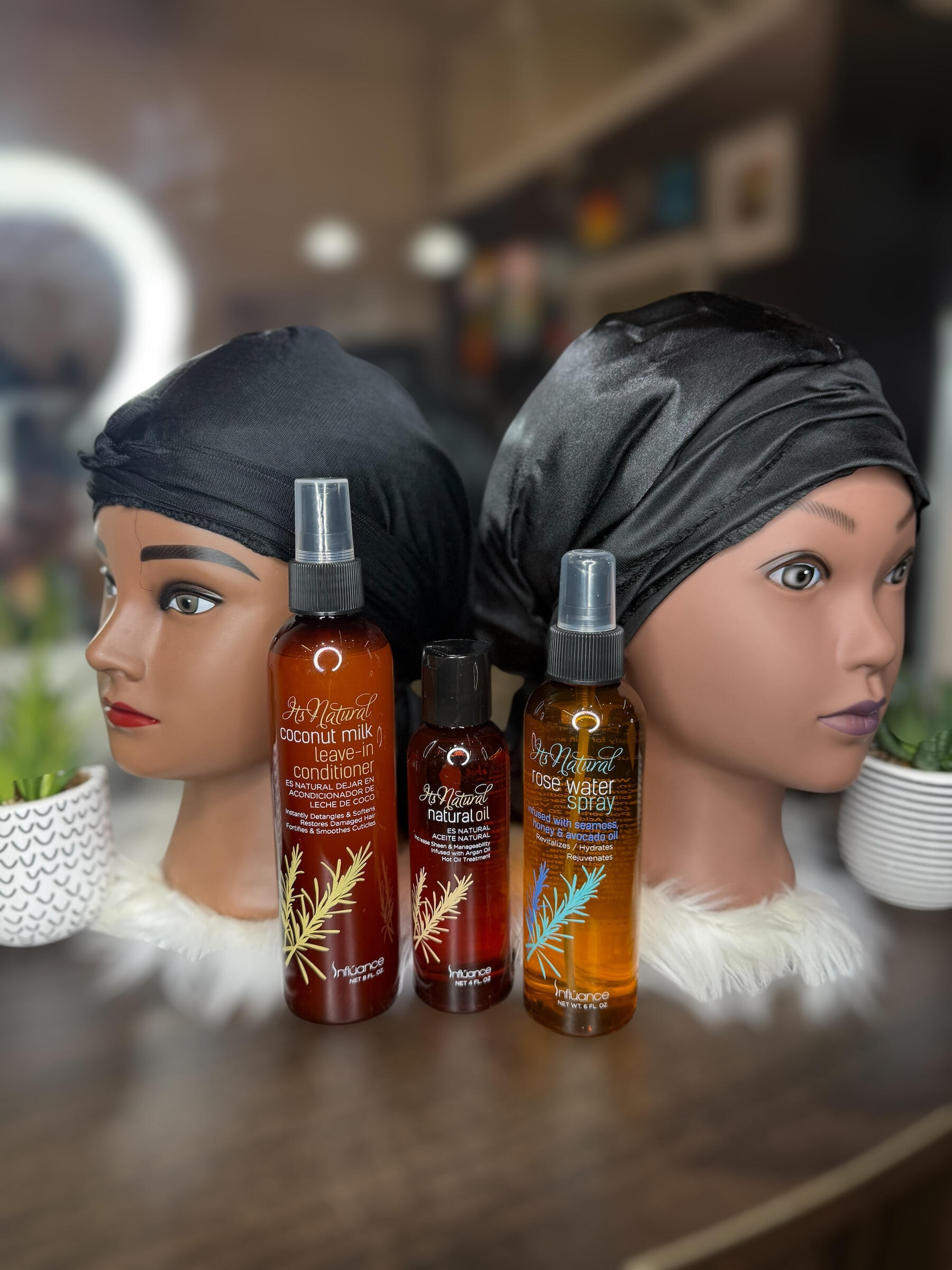 The Deluxe Crown Bundle is one of our best winter deals we highly recommend you take advantage of ! Not only does it include Coconut Leave In, Influance Rosewater Mist, Influance Natural Oil, Satin scarf & Du-rag. You will also get the Influance Moisture Lock Leave In Conditioner along with a reusable shower cap !! For those extra cold winter days.